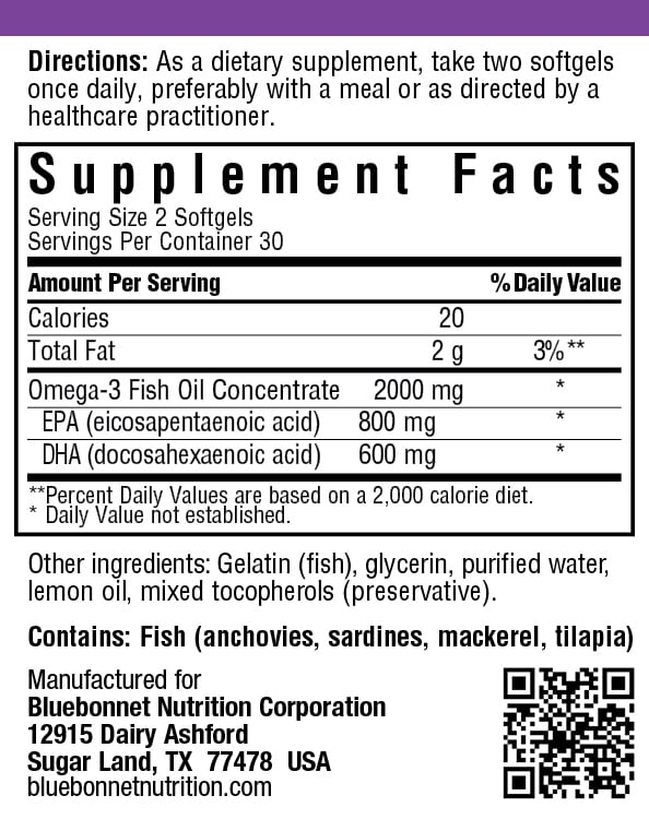 Bluebonnet’s Omega-3 Heart Formula Softgels supply EPA and DHA in a relatively balanced ratio scientifically relevant for maintaining cardiovascular health. The fish oil used is derived from deep sea‚ cold water fish off the coast of Peru that has been molecularly distilled‚ and has been 3rd party tested by an independent‚ cGMP-registered laboratory using AOAC/AOCS methods for purity and potency. In addition‚ a more bioavailable/stable triglyceride form of fish oil is used instead of the common synthetic ethyl ester form. To ensure sustainability‚ an unrivaled surveillance system is employed to control minimum size and number of juvenile fish caught. Available in easy-to-swallow softgels for maximum assimilation and absorption.